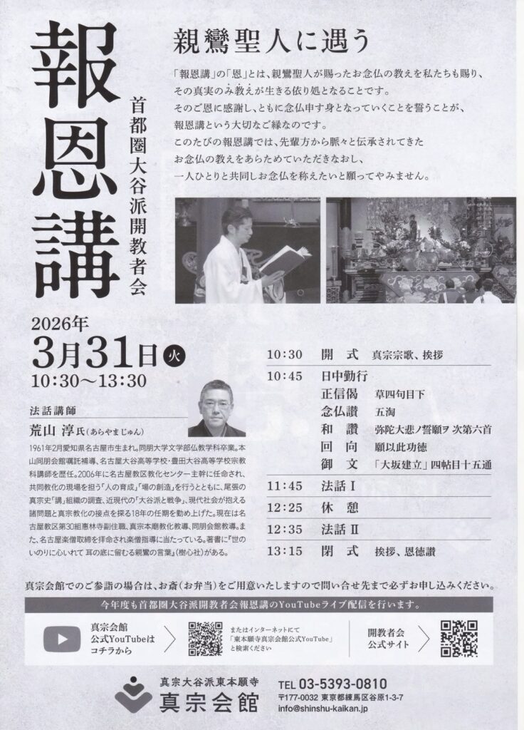 3月は年間最大の仏事「首都圏大谷派開教者会報恩講」が31日に勤まります。ご門徒である以上は必ずこのご法要に参加して下さい。参加しないならばご門徒とは言えないのです。