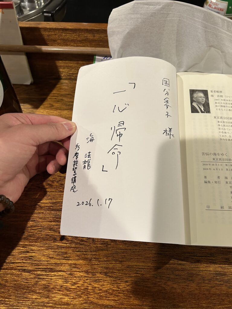 先日、帯広別院の御門徒さんとの電話で昨年の報恩講の布教使が海先生で、海先生の本にみんなでサインを書いてもらったと嬉しそうにお話しをされていて、それを坊守に話しをしたら、私も欲しい!と本とペン✒️を持って会場へ。