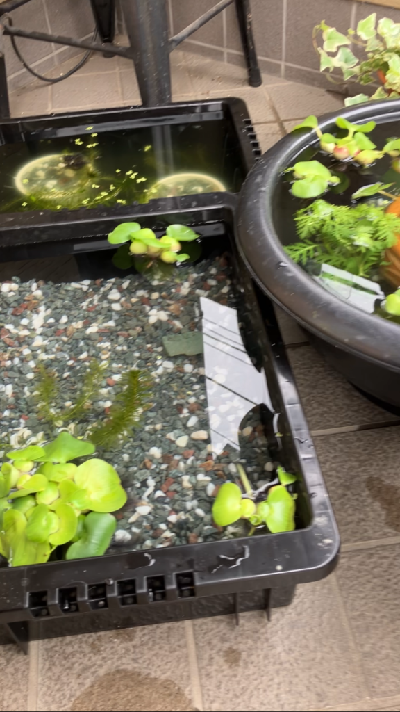 お寺の玄関先の睡蓮鉢はめだかちゃん不在が続いていましたが、ご近所さんから多種のめだかを譲っていただきました。すぐに産卵して赤ちゃん(針子)がたくさん誕生しました。すくすく成長しています。鉢の水換えをしたり環境を整えています。