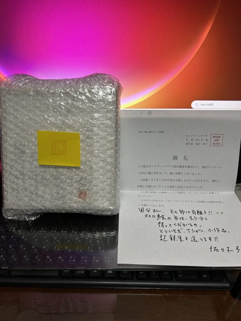 本日、モンクアートグドウの築地本願寺の展示会で購入した作品とTシャツが届きました。同じ高校の出身で、なおかつ在家の出身と同じ共通点が多い先輩が、各地で活躍されて嬉しいです。